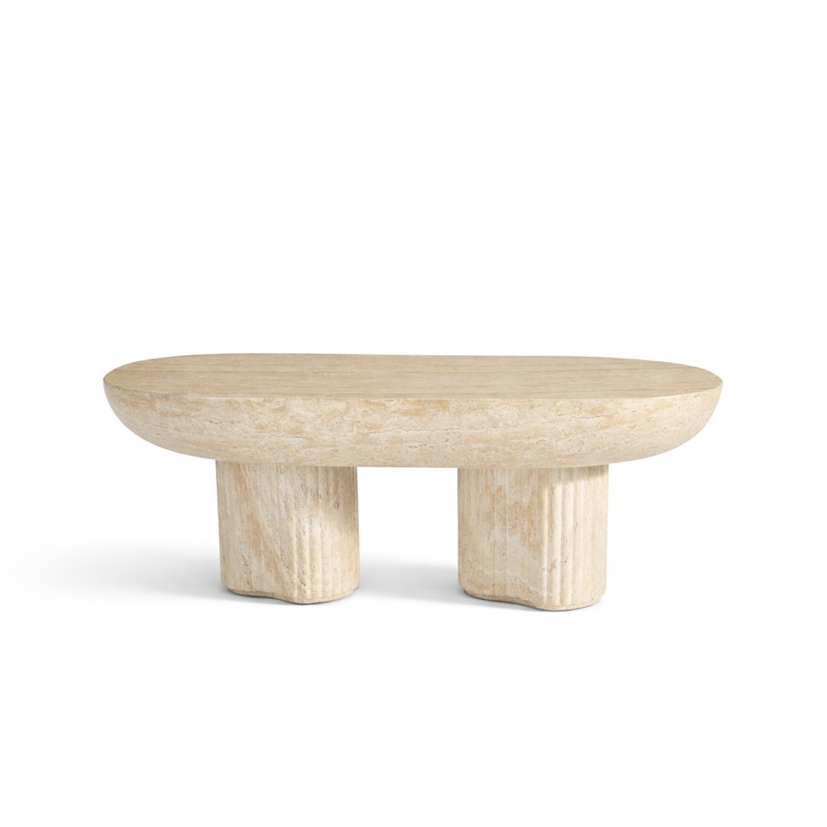 Bạn dễ dàng nhận thấy điểm nỗi bật của mẫu bàn trà với kiểu dáng chân trụ xẻ rãnh, tạo nên chiều sâu thị giác đầy ấn tượng kết hợp mặt bàn oval thon gọn.