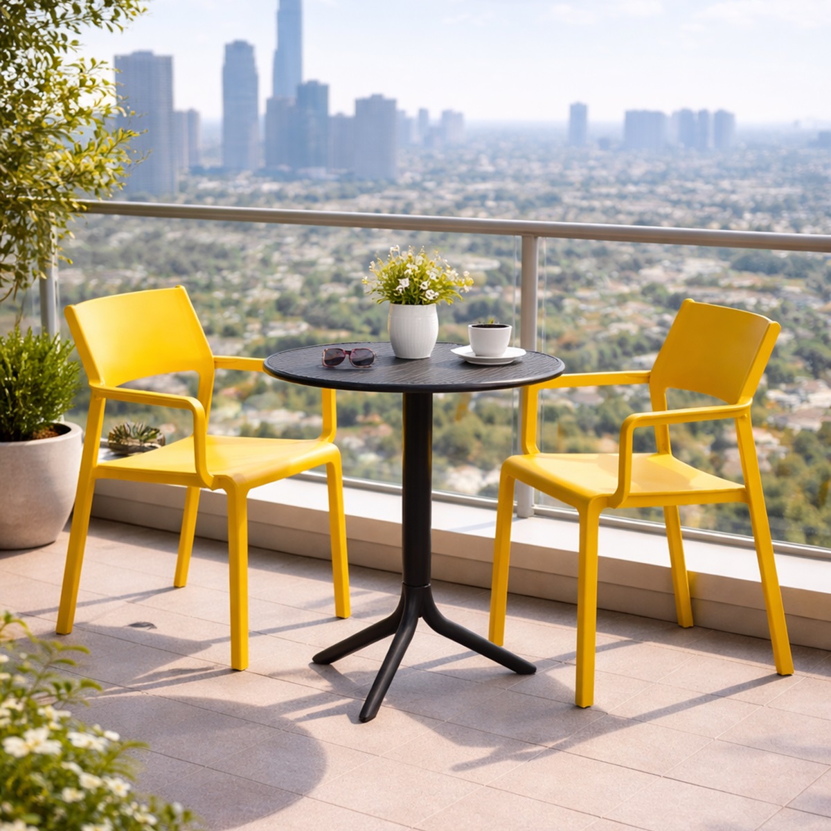 Bộ bàn ghế ban công được định hình theo phong cách nội thất Ý sang trọng, nơi mỗi đường nét đều hướng đến sự tinh giản, thanh lịch và giá trị thẩm mỹ bền vững. Thiết kế ghế với phom dáng mềm mại, hiện đại kết hợp cùng bàn tròn thanh thoát tạo nên tổng thể hài hòa, phù hợp với ban công căn hộ cao cấp, sân thượng riêng tư hay không gian ngoài trời mang tinh thần sống tinh tế. Sản phẩm sử dụng nhựa sợi thủy tinh cao cấp, cho kết cấu bền chắc, trọng lượng gọn nhẹ và khả năng thích nghi tốt với môi trường ngoài trời. Đặc biệt, vật liệu được kết hợp phụ gia chống tia UV giúp hạn chế bạc màu, lão hóa bề mặt và duy trì vẻ đẹp sang trọng theo thời gian.