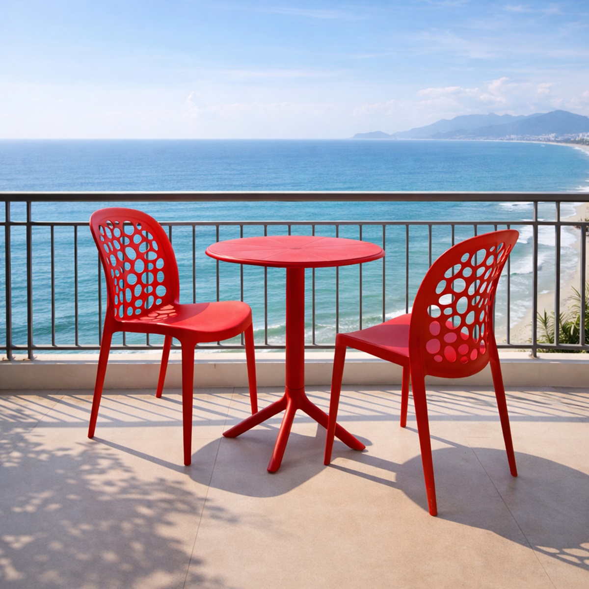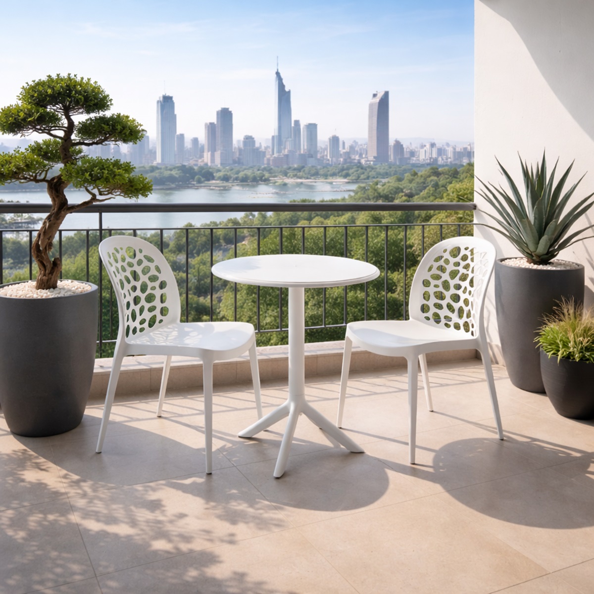 Bộ bàn ghế ban công ngoài trời mang phong cách nội thất hiện đại, sang trọng là lựa chọn lý tưởng cho những không gian sống hiện đại đề cao tính thẩm mỹ và sự tiện nghi. Với thiết kế thanh thoát, đường nét bo cong mềm mại cùng tỷ lệ hài hòa, bộ sản phẩm tạo nên một góc thư giãn tinh tế cho ban công căn hộ, sân thượng, logia hoặc khu vực ngoài trời cao cấp.