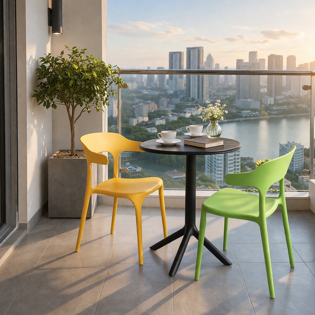 Thiết kế hiện đại, màu sắc tinh tế, kích thước nhỏ gọn, phù hợp ban công căn hộ chung cư hiện đại. Khả năng xếp chồng của ghế kết hợp bàn tròn linh động, trọng lượng nhẹ, dễ dàng di chuyển, sắp đặt và bảo quản. Thiết kế còn phù hợp làm bàn ghế cho không gian cafe, sân vườn, hay sân thượng…