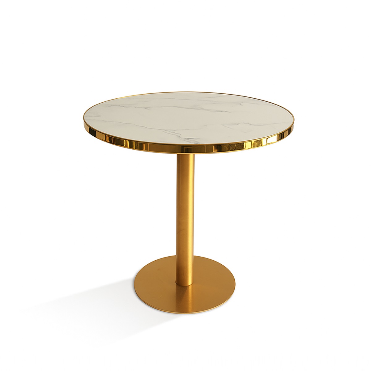 + Chất liệu: Mặt mica giả đá viền inox xi vàng PVD, chân thép mạ PVD